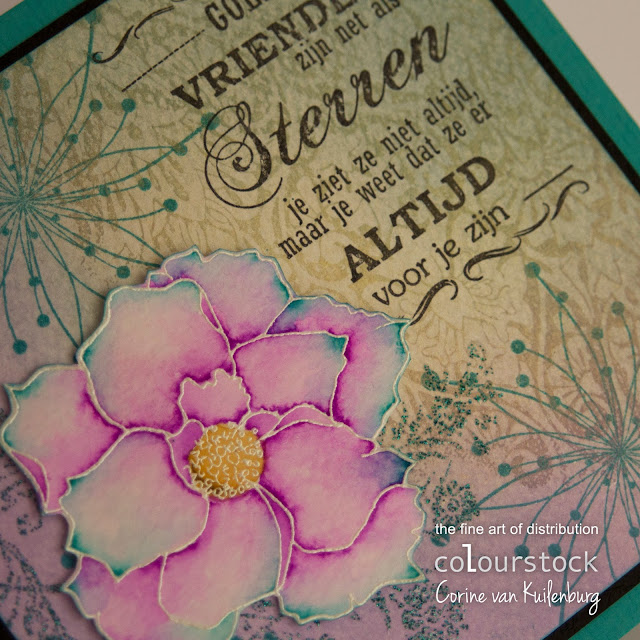 De bloem (Impression Obsession) heb ik geëmbossed met witte parelmoer embossingpoeder op canvaspapier en ingekleurd met markers en een waterpenseel.